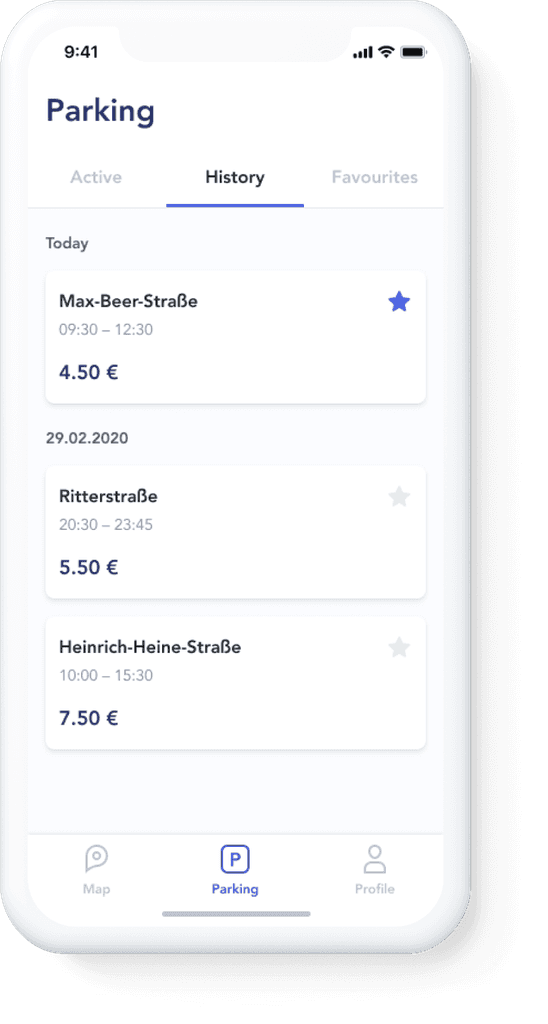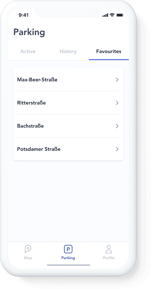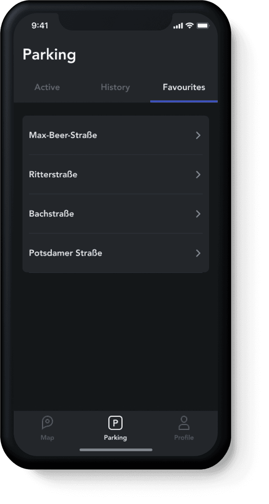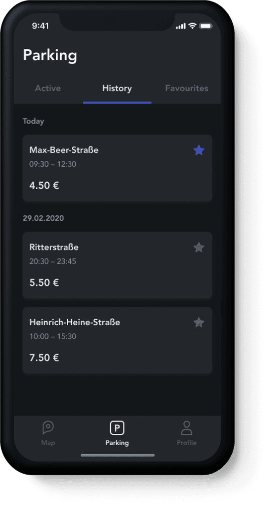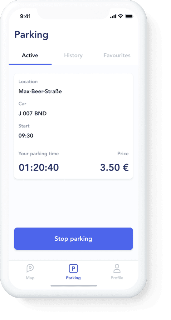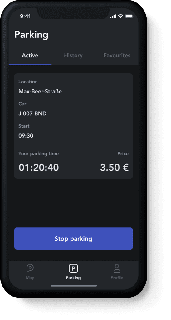 Here a driver can get info about his current parking, check previous spots, and edit favourite places. During the session the driver is informed about parking time, and the total amount due to pay for use of the space. This menu includes 3 tabs:
