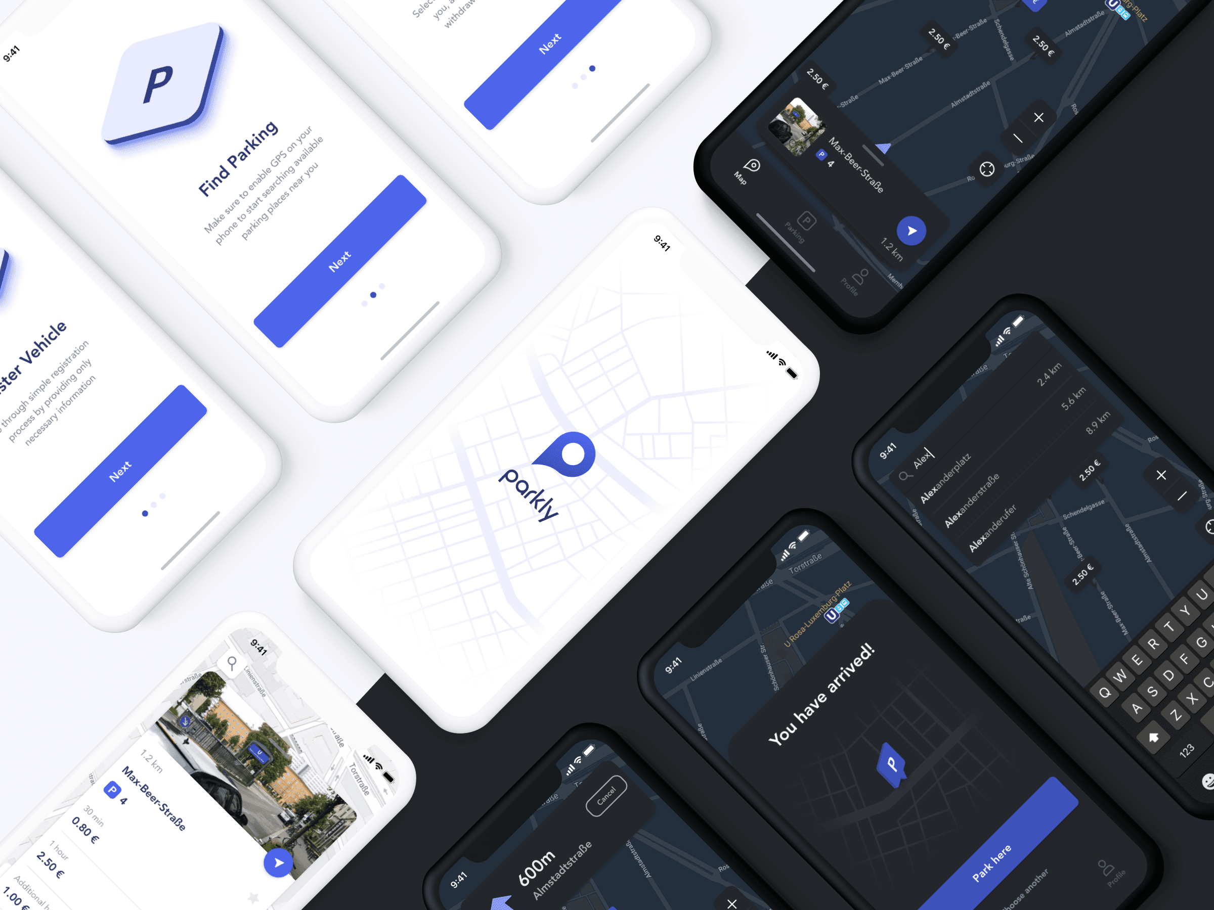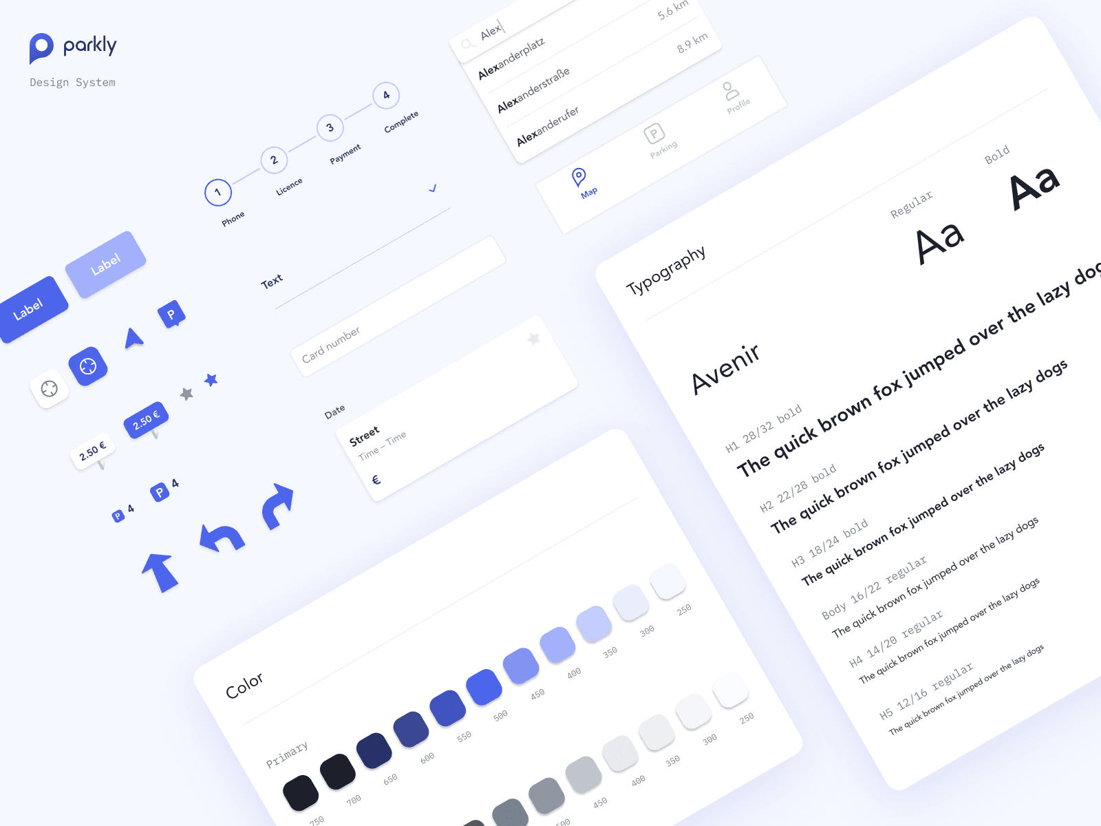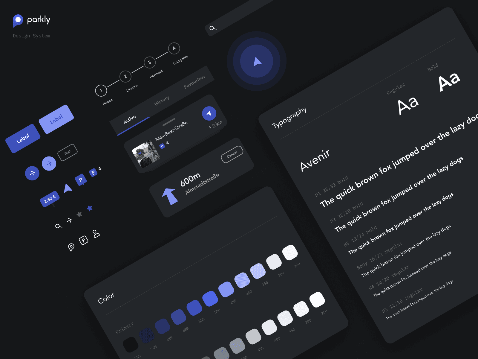The design system for parkly app has been developed considering light and dark mode components.